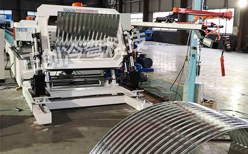 一、涵洞波紋板設備圖片整條生產線由放料/引料系統、成型系統、自動輸送/定位系統、沖孔系統、自動收料系統、打彎弧系統、電控系統等部分組成。